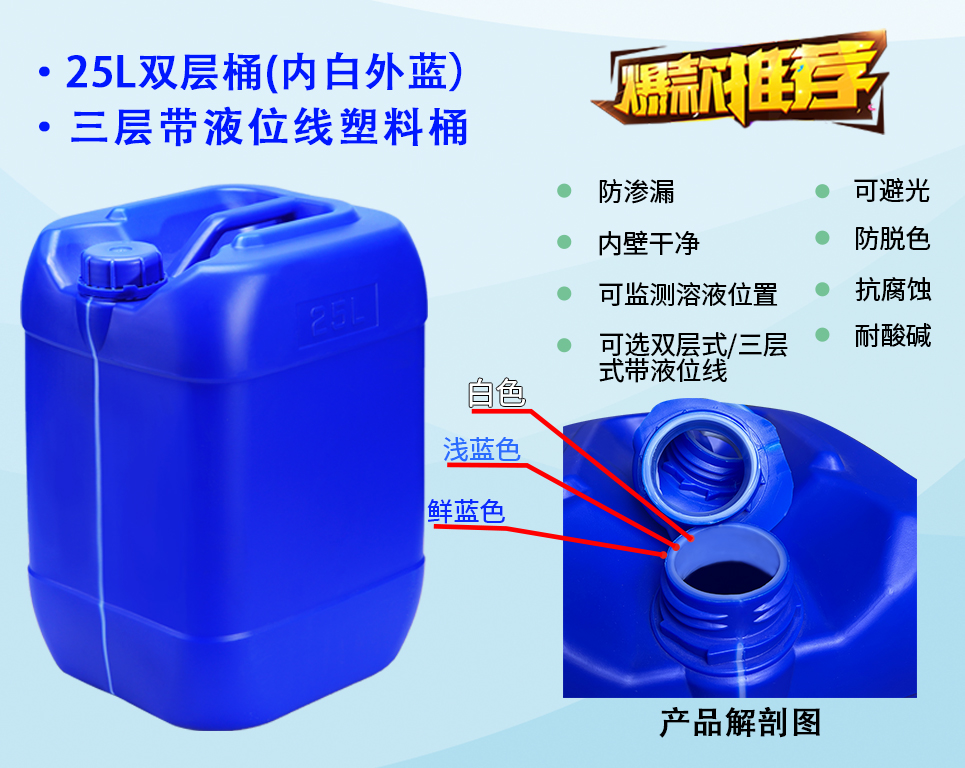 25升30升雙層雙色化工桶、三層三色帶液位線(xiàn)塑料桶、防靜電塑料桶